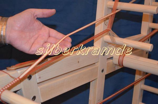 Dabei werden natürlich die Fäden anders aufgespannt, ohne Brettchen – das Haupt-Fach entsteht hier dadurch, dass einige Fäden mit Litzen nach unten gebunden werden.